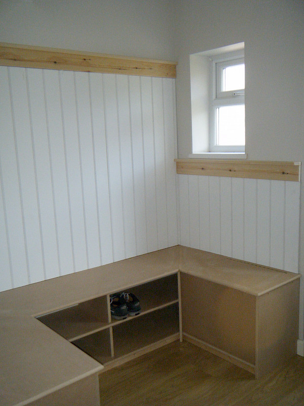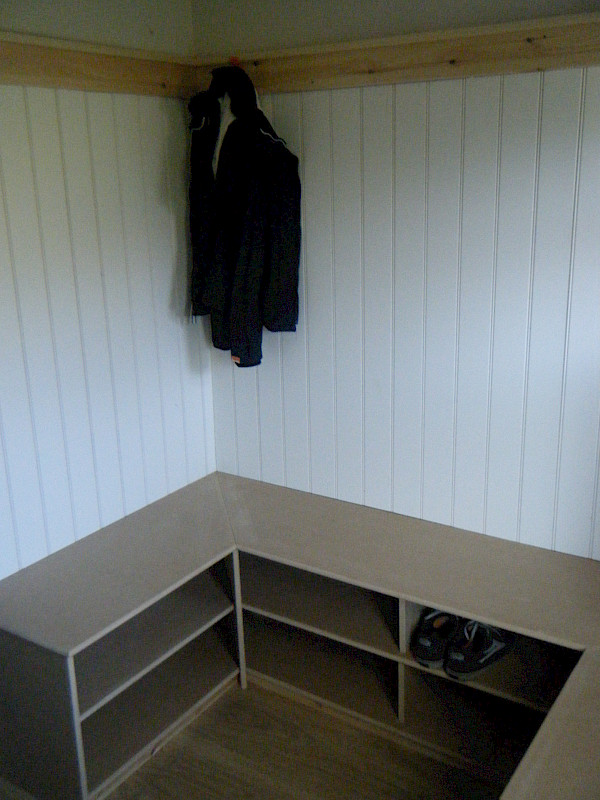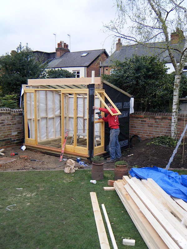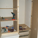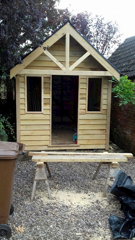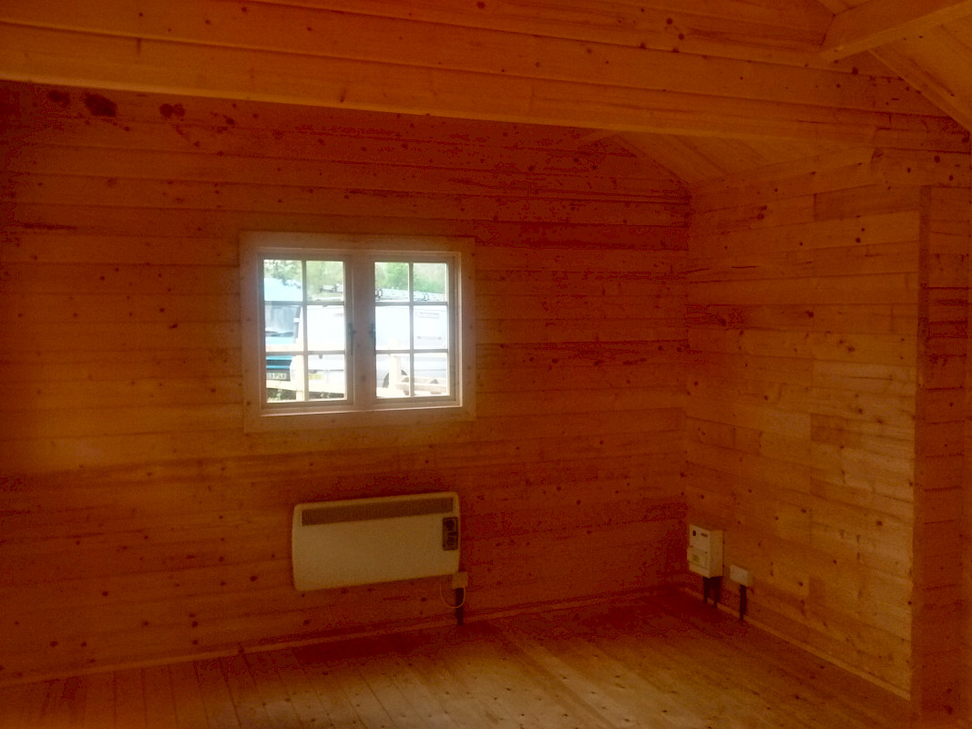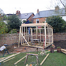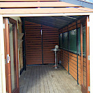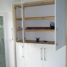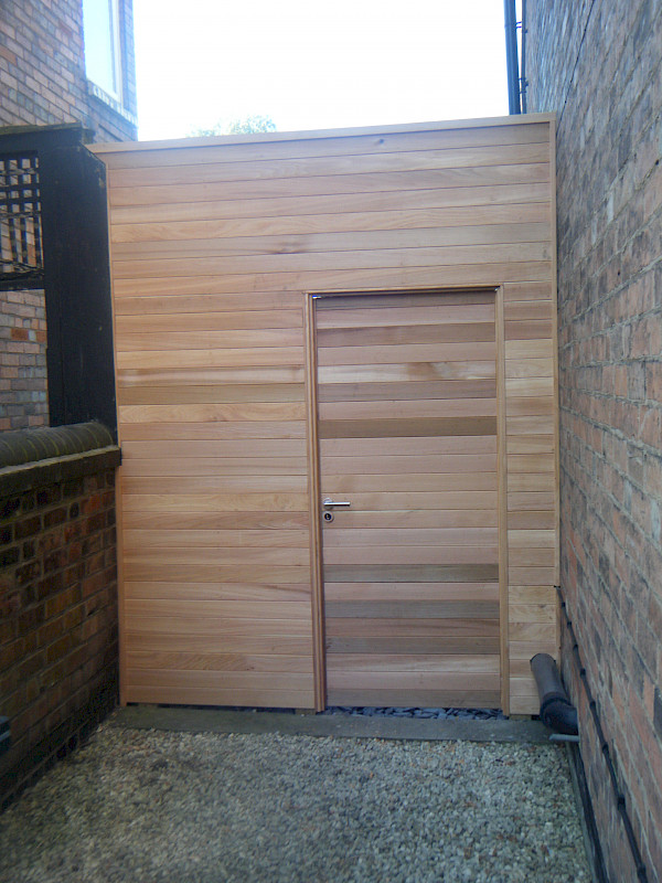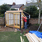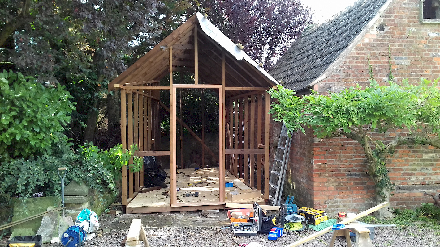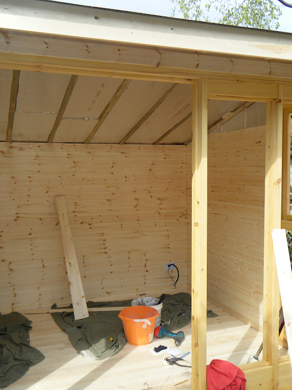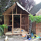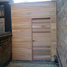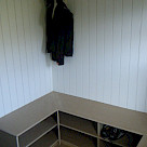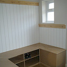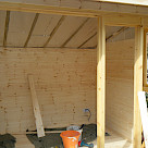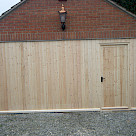 My customer had a workshop but found it very cold in the winter months. I decided to build a stud wall in front of the metal shuttering, I then insulated it with 75mm Kingspan thermal board. On the inside I attached 18mm chipboard sheets to the stud wall. On the outside I faced it with 19mm joinery grade matchboard. A framed, legded and braced door for access was also fitted to the right hand side. Result: a happy warm customer who can tinker on his projects all year.